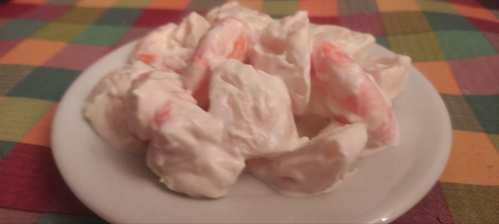 500 gr de patatas, 150 gr de langostinos, sal, agua, 4 cebolletas, mayonesa.