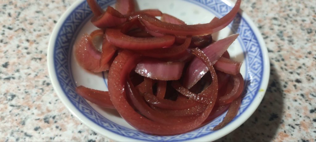 1 cebolla roja, 200 ml de vinagre de vino tinto, azúcar moreno, sal, 50 cl de agua, 1 hoja de laurel.