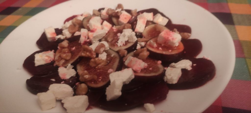 1 remolacha, 2 higos, 1/2 burrata, aceite de oliva, sal, vinagre de vino manzana, nueces.