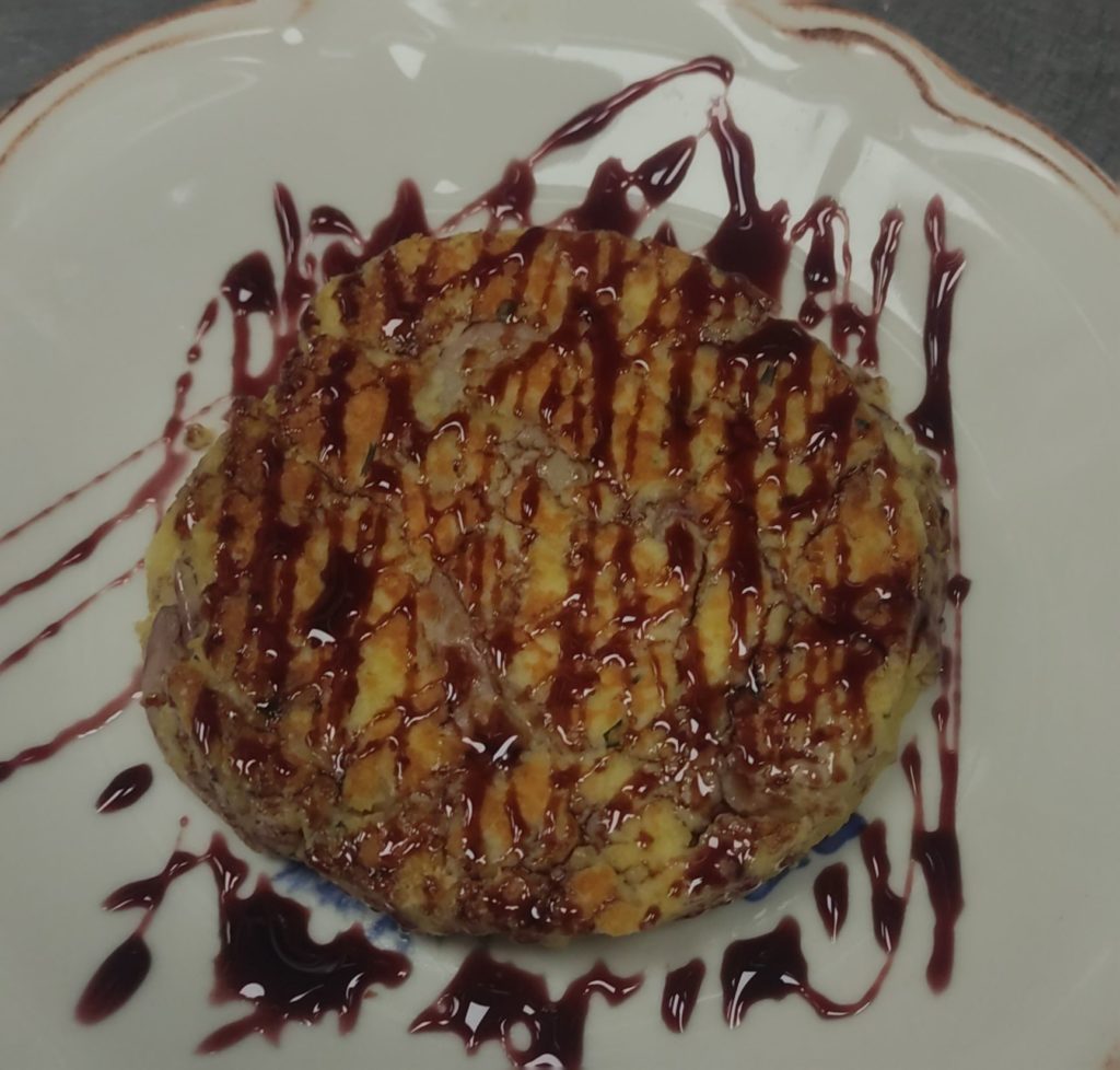 100 gr de papas aliñás, 1 huevo, aceite de oliva, pan rallado, reducción de vino tinto, aceite de oliva.