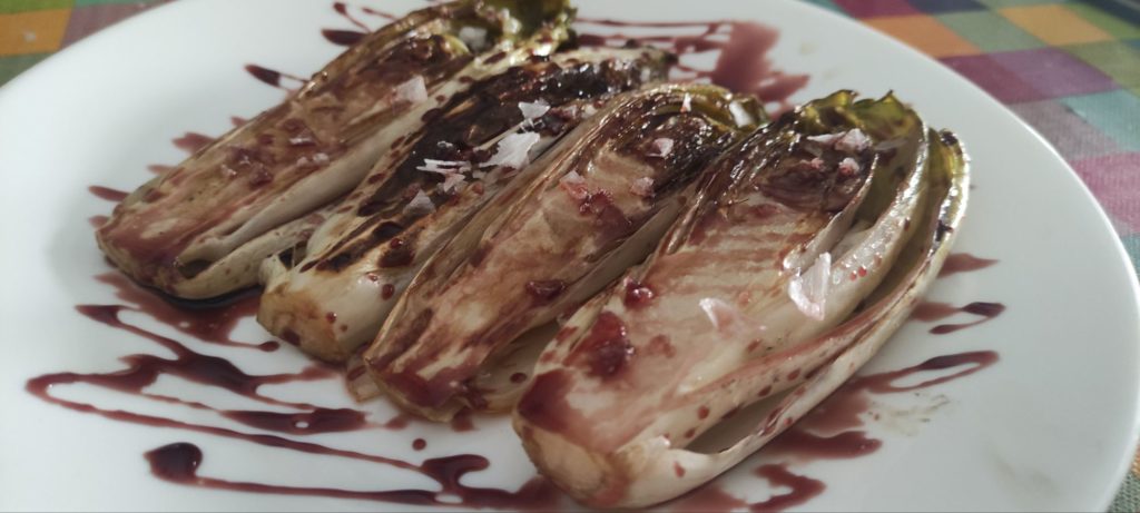 Soy una persona a la que le gustan especialmente las endivias. Su textura y sabor amargo me agradan mucho. Las suelo consumir aliñadas y también, como en este caso, a la plancha. Les añado una reducción de vino tinto que hace contraste con su sabor.