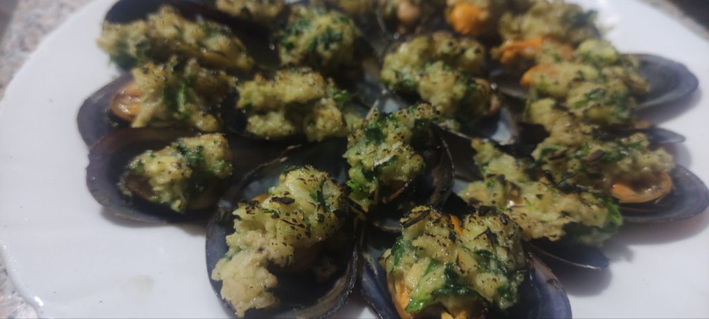 A la hora de servir dejar solo una de las valvas del mejillón, desechando la otra. Distribuir los mejillones por el plato y napar con el sofrito por encima. Servir caliente.